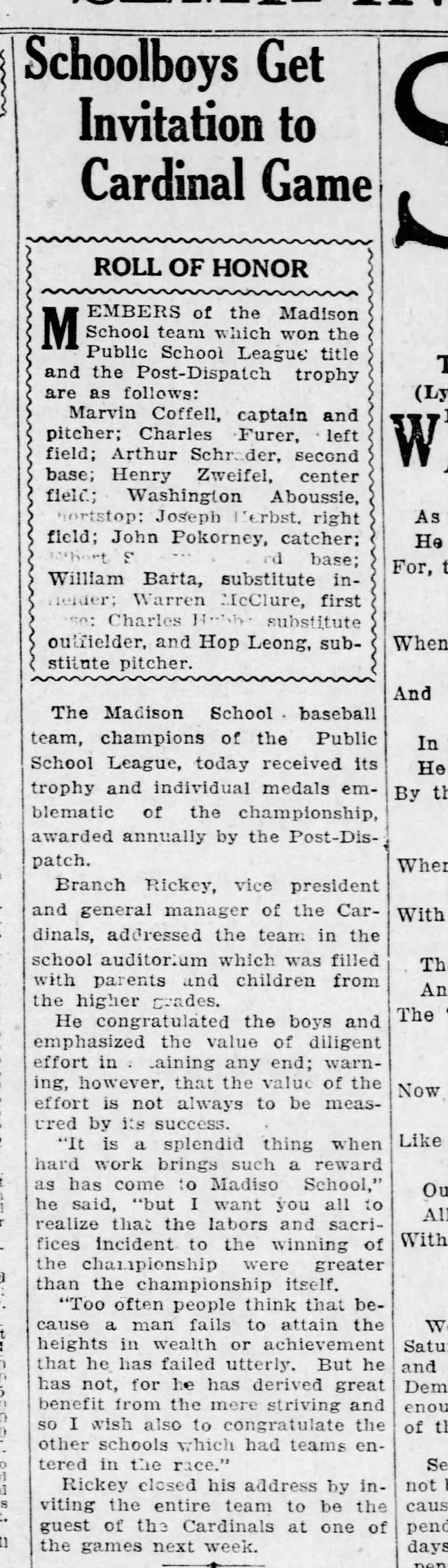Impressed with this championship team and group of boys, on June 16, 1927, Branch Rickey, vice president and general manager of the St. Louis Cardinals, went to the Madison School to speak to the players and parents, ending with an invitation to a St. Louis Cardinals game. Hop Leong was listed on the Roll of Honor, for all the public to see.